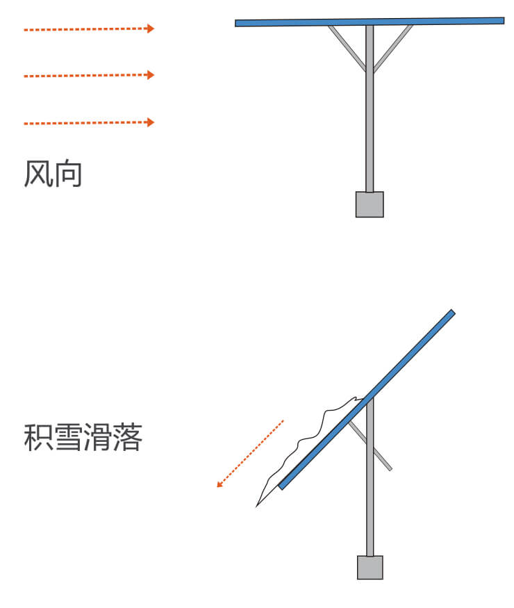 抗雪功能:当系统检测到降雪量大于程序设定的降雪量,则系统放弃跟踪太阳,打到最大 倾斜角度状态,方便积雪滑落;当检测到连续一段时间无降雪,则恢复跟踪。
